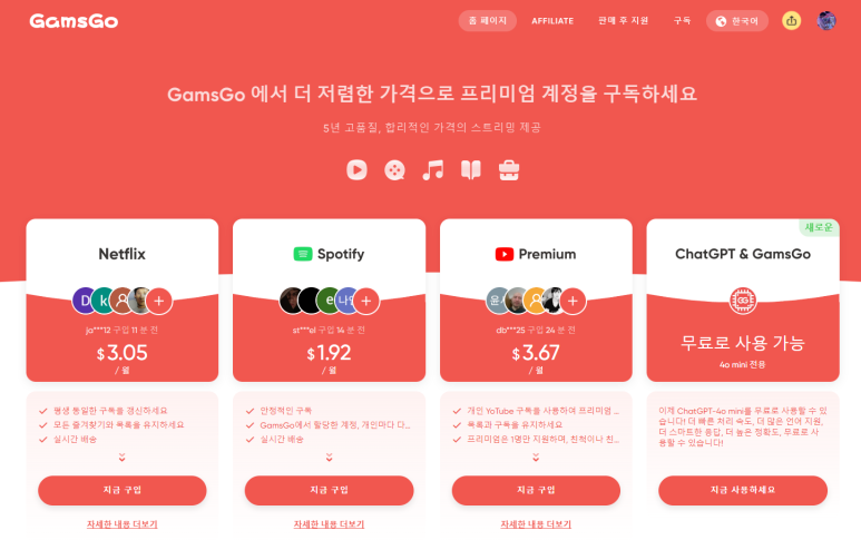 구매 시 할인코드 입력 항목이 있으며, [KUHMH]를 입력하면 넷플릭스와 유튜브는 5%, 그 외에는 3% 추가 할인을 받을 수 있습니다.